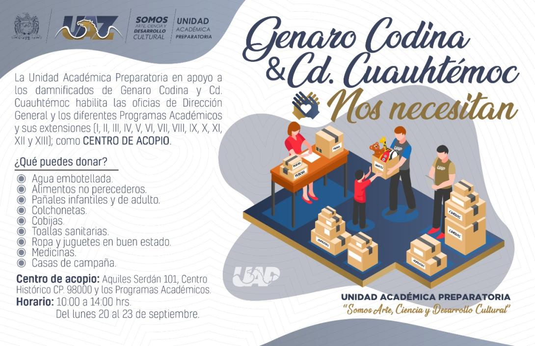 Por ga_fibelal | Sáb, 18/09/2021 - 21:46 La Unidad Académica Preparatoria en apoyo a la sociedad afectada por las intensas lluvias en los municipios de Genaro Codina y Cd. Cuahutémoc.