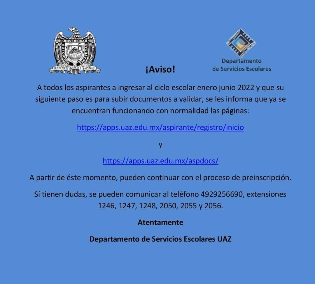 A todos los aspirantes a ingresar al ciclo escolar Enero Junio 2022 y que su siguiente paso es subir documentos a validar, se les informa que ya se encuentran funcionando con normalidad las páginas: