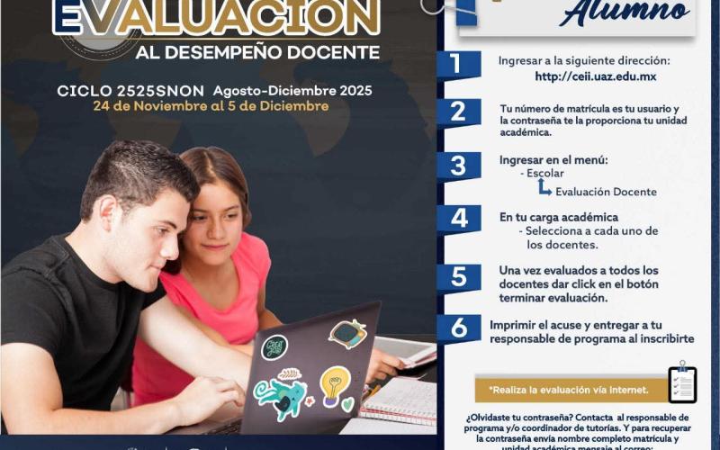 Por admin.uap | Sáb, 22/11/2025 - 17:45 Estudiante de la UAPUAZ, participa en la evaluación de tus docentes en la encuesta oficial de la Evaluación al Desempeño Docente en la página http://ceii.uaz.edu.mxRevisa la infografía para más detalles. Categorías Estudiantes UAZ Ciclo escolar 2025-2026 Etiquetas Evaluación al desempeño docente