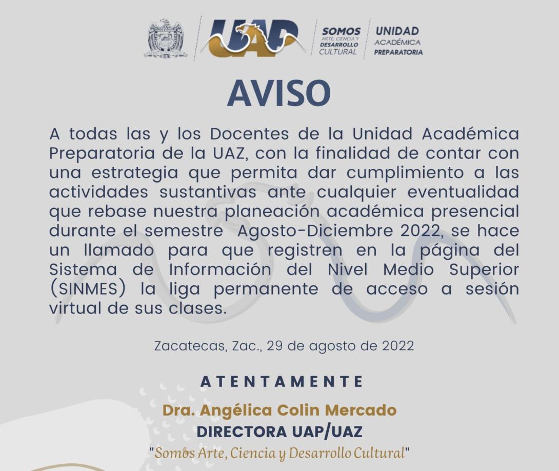 A todas las y los Docentes de la Unidad Académica Preparatoria de la UAZ, con la finalidad de contar con una estrategia que permita dar cumplimiento a las actividades sustantivas ante cualquier eventualidad que rebase nuestra planeación académica presencial durante el semestre Agosto-Diciembre 2022, se hace un llamado para que registren en la página del Sistema de Información del Nivel Medio Superior (SINMES) la liga permanente de acceso a sesión virtual de sus clases.